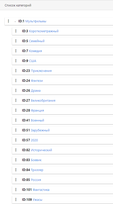 - Жанры, года и страны в подкатегориях по типу видео идут не по порядку ID, что затруднит настроить только вывод непосредственно жанров из категорий через кастом или фильтр.