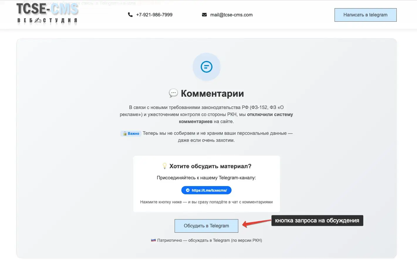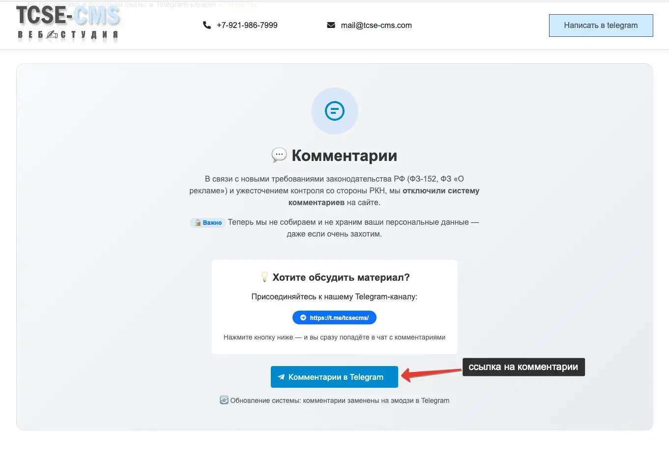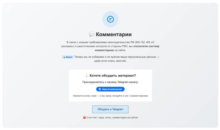 На странице отображается прямая ссылка на обсуждение в Telegram