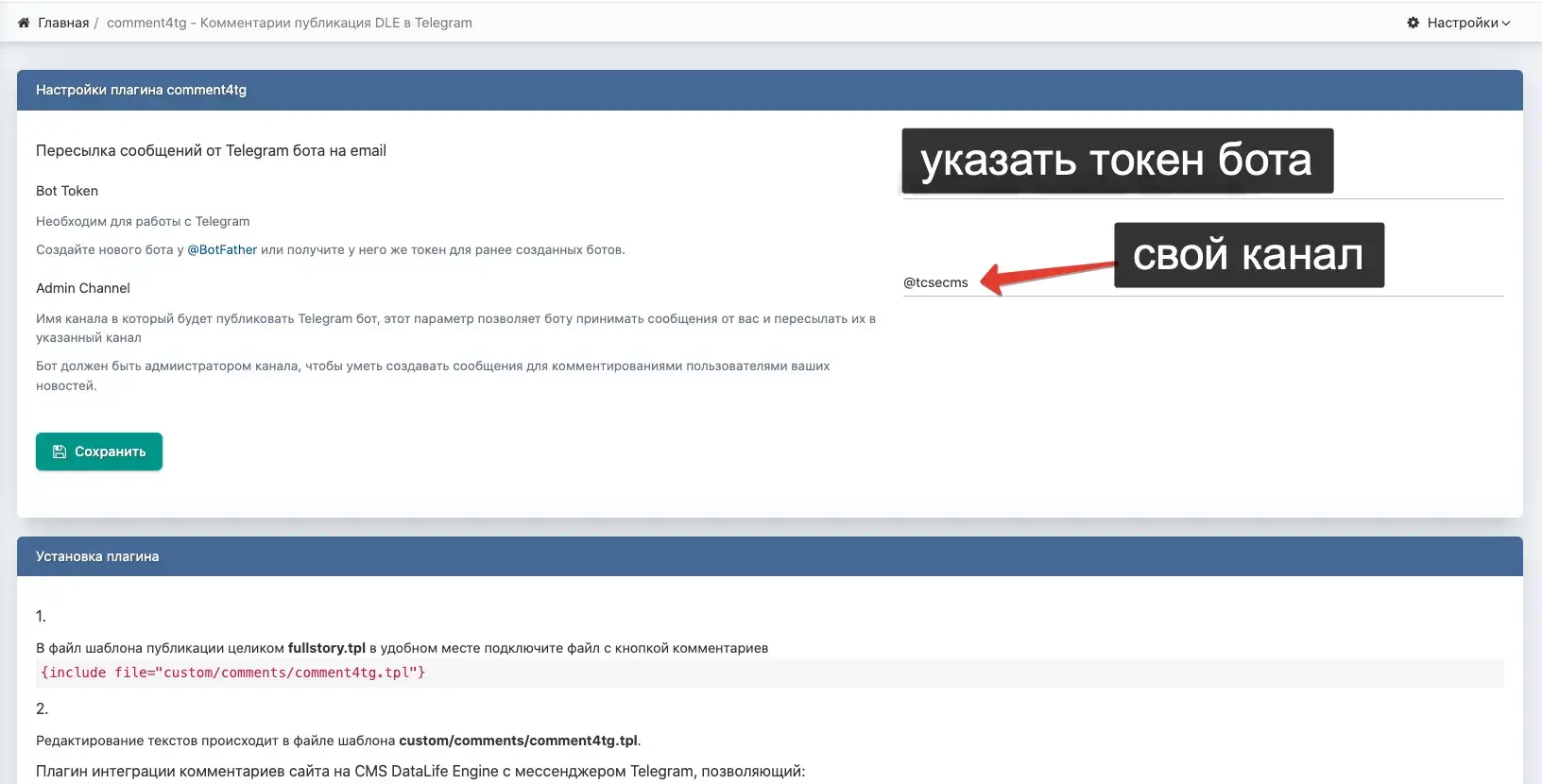 Укажите токен бота и канал в engine/data/comment4tg.php