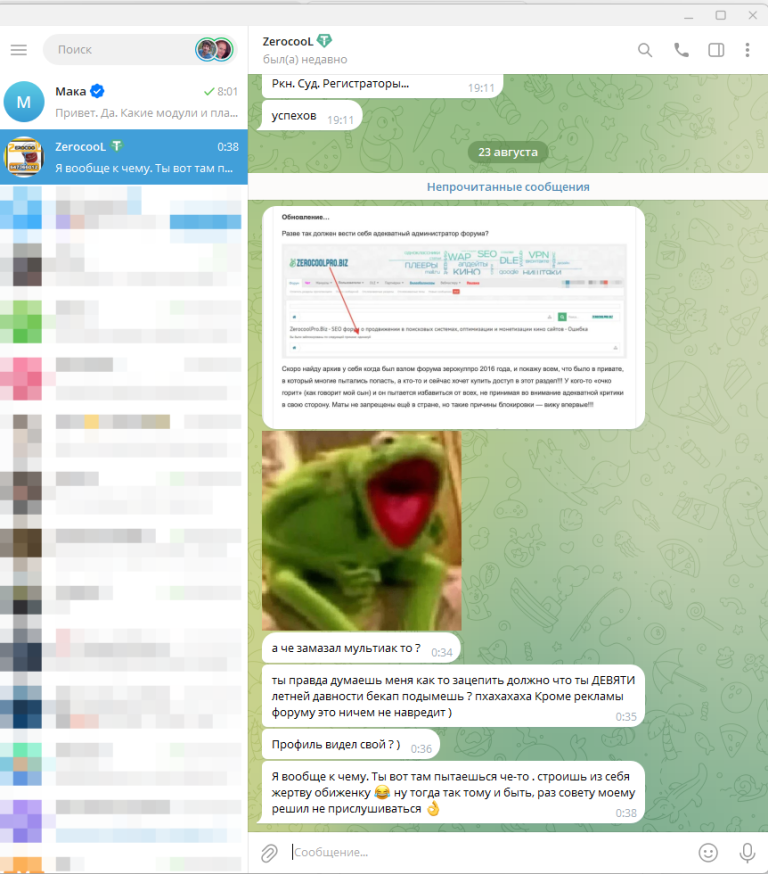 Скоро найду архив у себя когда был взлом форума зерокулпро 2016 года, и покажу всем, что было в привате, в который многие пытались попасть, а кто-то и сейчас хочет купить доступ в этот раздел!!! У кого-то «очко горит» (как говорит мой сын) и он пытается избавиться от всех, не принимая во внимание адекватной критики в свою сторону. Маты не запрещены ещё в стране, но такие причины блокировки — вижу впервые!!!