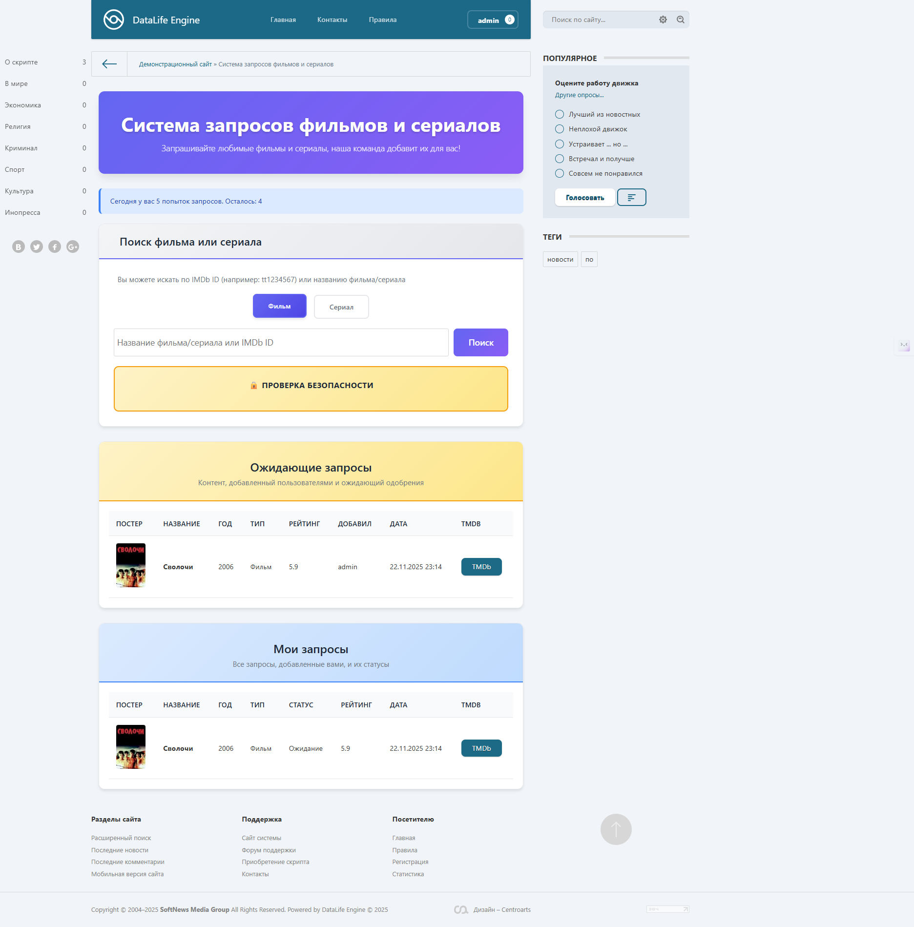 Статическая страница: создайте новую статическую страницу и добавьте модуль, используя следующий код:[include file="engine/modules/film_requests.php"]