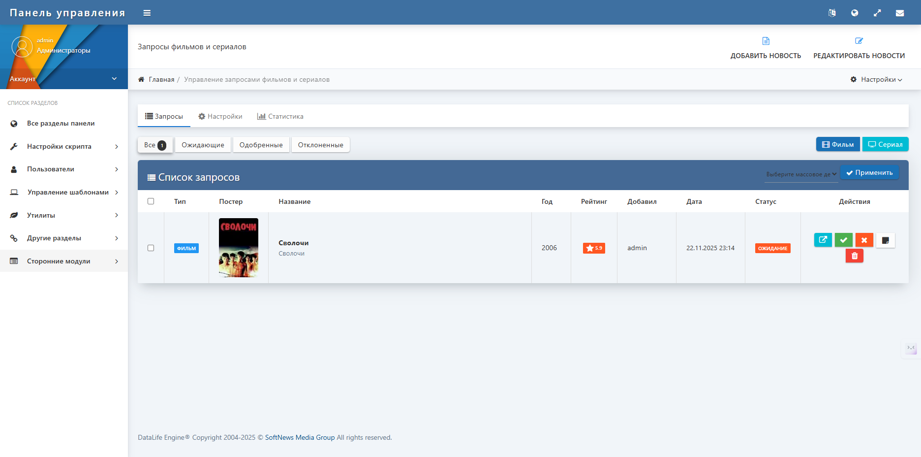 - В панели администратора перейдите в раздел «Запросы фильмов и сериалов» > «Настройки» .