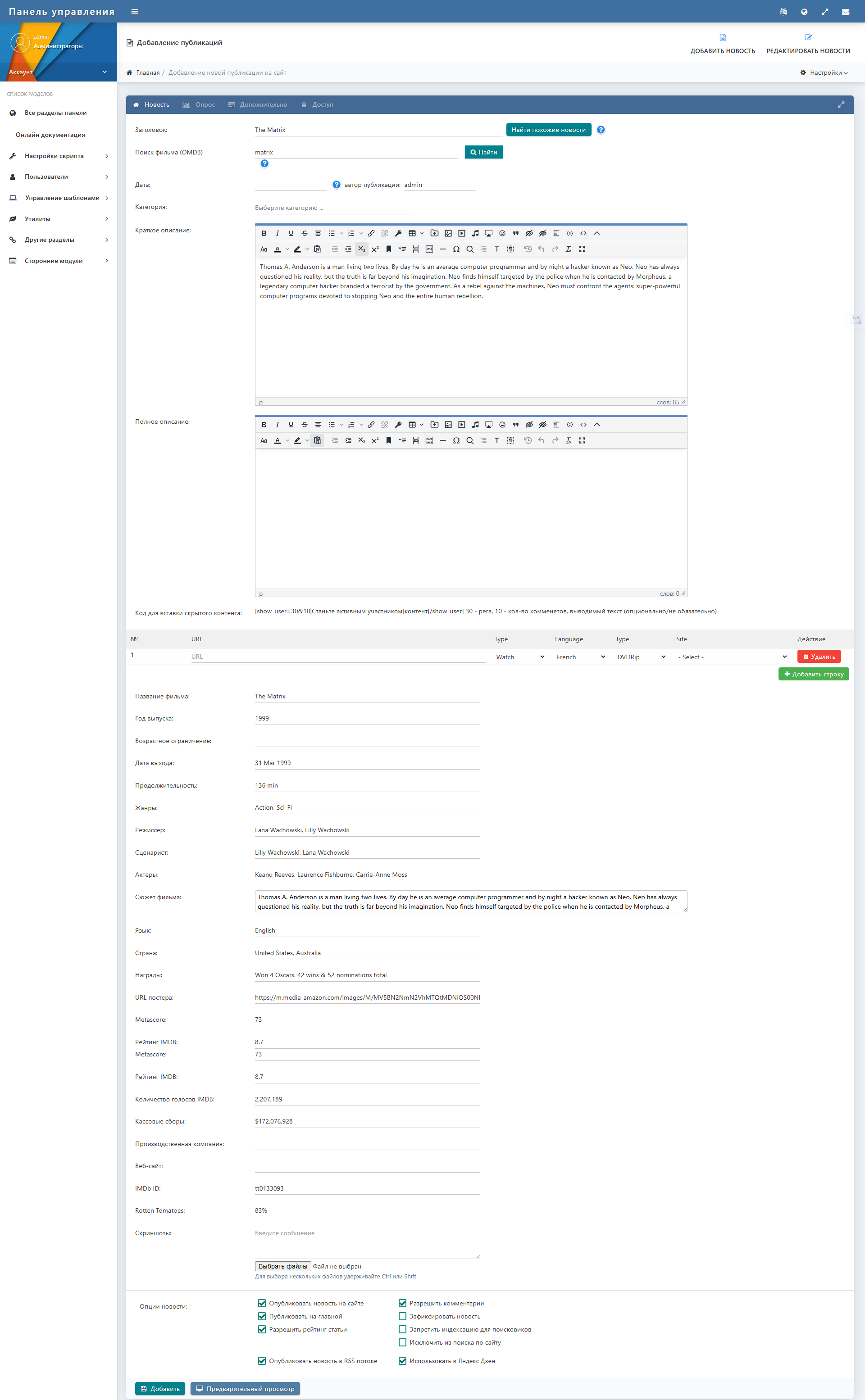 Плагин позволяет автоматически заполнять новости информацией о фильмах и сериалах из базы данных OMDB (The Open Movie Database). С помощью этого плагина вы можете быстро создавать контент о кино, получая полную информацию о фильмах всего за несколько кликов.