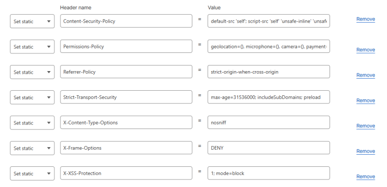 1. Set static Header name: X-Content-Type-Options Value: nosniff 2. Set static Header name: Referrer-Policy Value: strict-origin-when-cross-origin 3. Set static Header name: Content-Security-Policy Value: default-src 'self'; script-src... 4. Set static Header name: Permissions-Policy Value: geolocation=(), microphone=()... 5. Set static Header name: Strict-Transport-Security Value: max-age=31536000; includeSubDomains; preload 6. Set static Header name: X-Frame-Options Value: DENY 7. Set static Header name: X-XSS-Protection Value: 1; mode=block - Теперь на securityheaders.com — у вас должен быть A+ рейтинг, как на первом скрине!