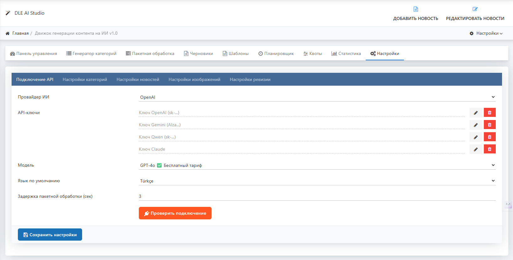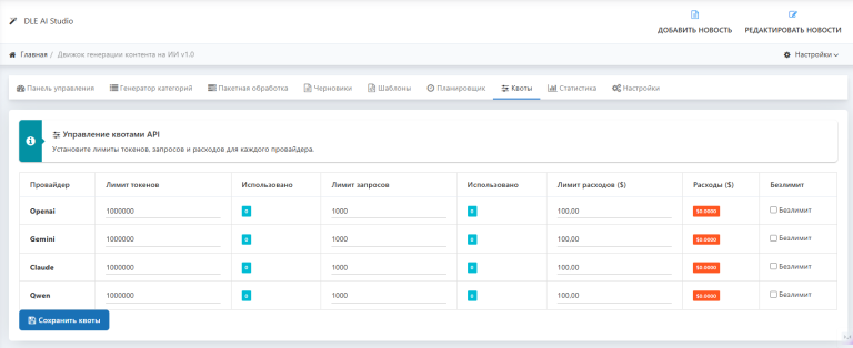 DLE AI Studio — это профессиональный модуль искусственного интеллекта для DLE, который позволяет автоматически создавать SEO-оптимизированный контент как для категорий, так и для новостей, используя самые передовые модели ИИ: OpenAI (GPT), Google Gemini, Anthropic Claude и Alibaba Qwen.