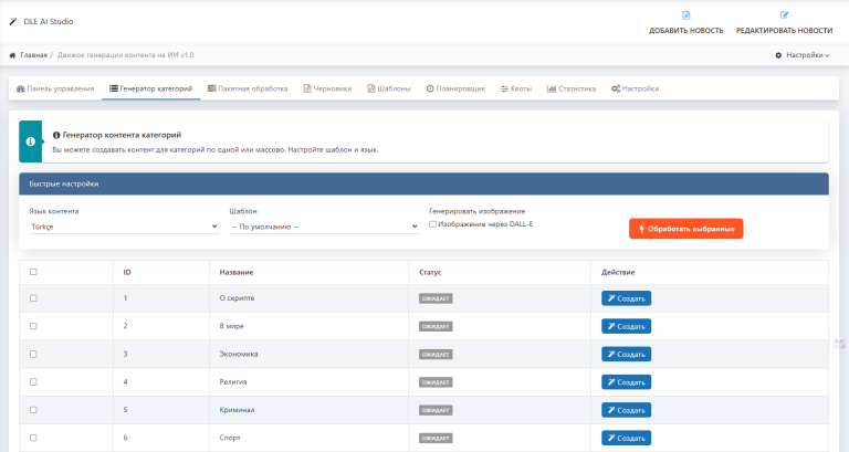 📋 Пакетная обработка: одновременная генерация контента для множества категорий или новостей.