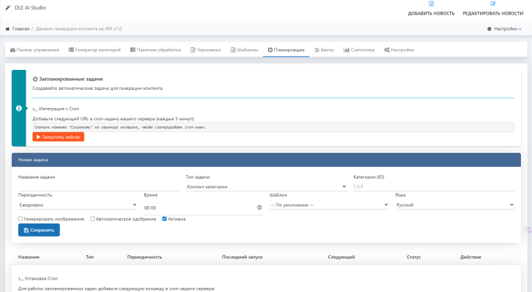 ⏰ Планировщик задач: автоматический запуск генерации по расписанию (ежечасно, ежедневно, еженедельно и т. д.) - engine/modules/catman_cron.php.