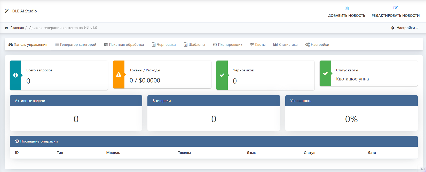 Модуль полностью интегрирован в административную панель DLE и предлагает широкий набор функций: