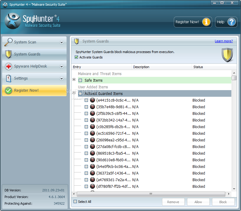 - SpyHunter - антишпион с адаптивным обнаружением и удалением шпионского ПО. Обеспечивает непрерывную защиту от новейших вредоносных программ, троянов, фальшивых антивирусов. Включает систему Compact OS для надежного удаления руткитов.