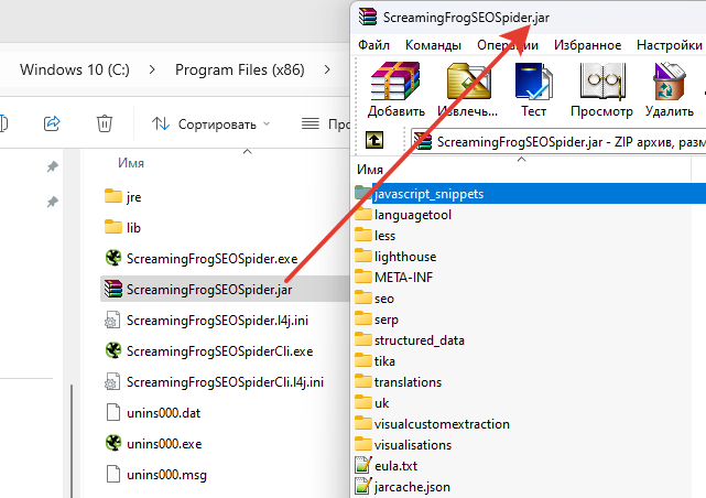 - Файл ScreamingFrogSEOSpider.jar нужно открыть архиватором, у меня это WinRAR: